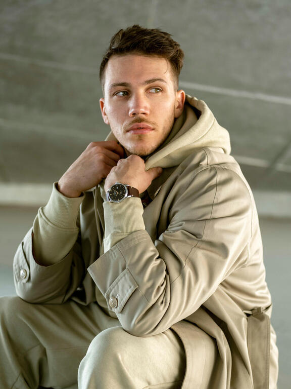 Корпус: Корпус из нержавеющей стали. Сапфировое стекло с антибликовым покрытием. Коричневый циферблат, с узором Sunray. Диаметр 40 мм. Водонепроницаемость 100 метров.