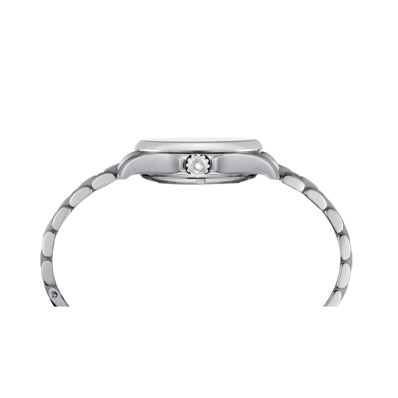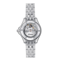 Корпус: Корпус модели выполнен из высококачественной стали марки 316L с повышенной устойчивостью к коррозии, поверхности с матовой шлифовкой – сатинированием и полировкой до зеркального блеска. Голубой циферблат украшен 8 бриллиантами цвета Top Wesselton. Одностороннее антибликовое покрытие сапфирового стекла. Прозрачная задняя крышка. Диаметр: 34,5 мм. Водостойкость: 200 м.