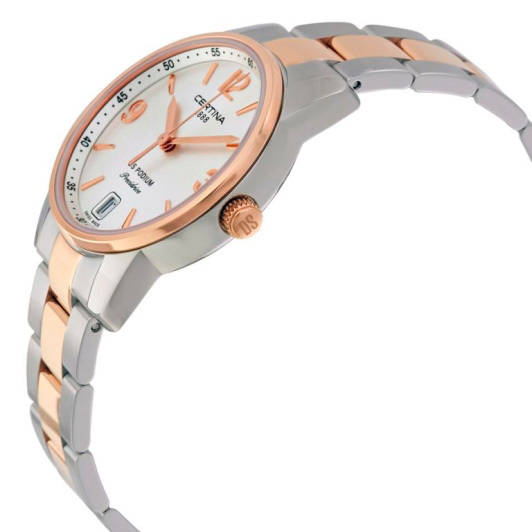 Корпус: Корпус из нержавеющей полированной/матовой стали с частичным PVD - покрытием из розового золота. Светлый циферблат с золотистыми стрелками и рисками. Сапфировое стекло с антибликовым покрытием. Диаметр 33 мм. Водостойкость 100 м. Система DS.