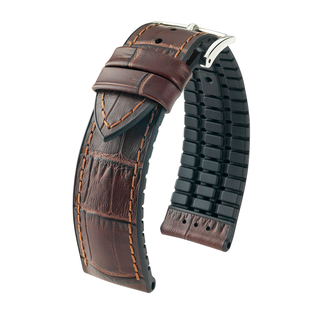 Описание: Лучшая итальянская телячья кожа Toscana с естественно выглядящим тиснением под аллигатора, полуматовая с характерным двухтоновым эффектом. Сердцевина HIRSCH Premium Caoutchouc. Основа ремня - черный каучук. Благодаря специальной рифленой подкладке обеспечивается постоянная циркуляция воздуха и незамедлительное отведение воды и пота, создавая так называемый "эффект сухой кожи". Подчеркнутая запатентованная прошивка. Интегрированный фиксатор ремешка. Цвет - коричневый. 100% антиаллергенность, система влаго- и паропроницаемости.