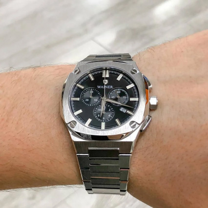 Корпус: Корпус часов выполнен из нержавеющей стали с матовой и полированной отделкой. Безель с декоративными винтами. Циферблат чёрного цвета выполнен по технологии Sunray (солнечные лучи) и защищен прочным сапфировым стеклом. Метки в виде штрихов. Клиновидные стрелки в стиле Dauphine с люминесцентным покрытием, которое светится в темноте после непродолжительной зарядки на свету. Граненая заводная головка. Завинчивающаяся задняя крышка. Диаметр корпуса 43 мм. Водонепроницаемость 50 метров.