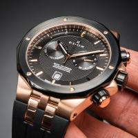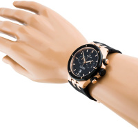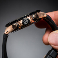 Корпус: Корпус выполнен из высококачественной стали с повышенной устойчивостью к коррозии цвета розового золота, с PVD-покрытием чёрного цвета по безелю. Чёрный циферблат. Стрелки позолоченные, полированные с покрытием Super-LumiNova®. Сапфировое стекло с антибликовым покрытием. Заводная головка с защитой. Завинчивающаяся задняя крышка. Заводная головка и кнопки управления хронографом с двойной прокладкой для герметичности. Диаметр: 43 мм. Водонепроницаемость: 200 м.