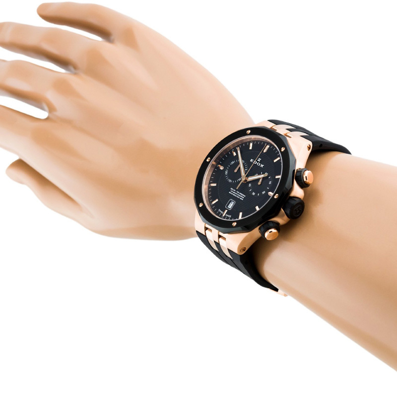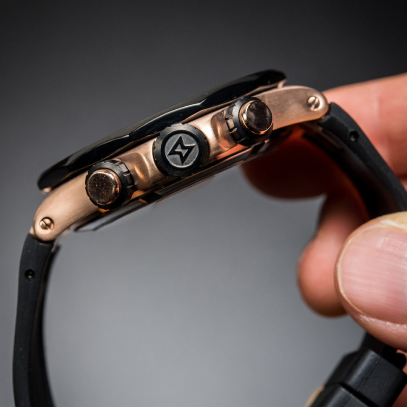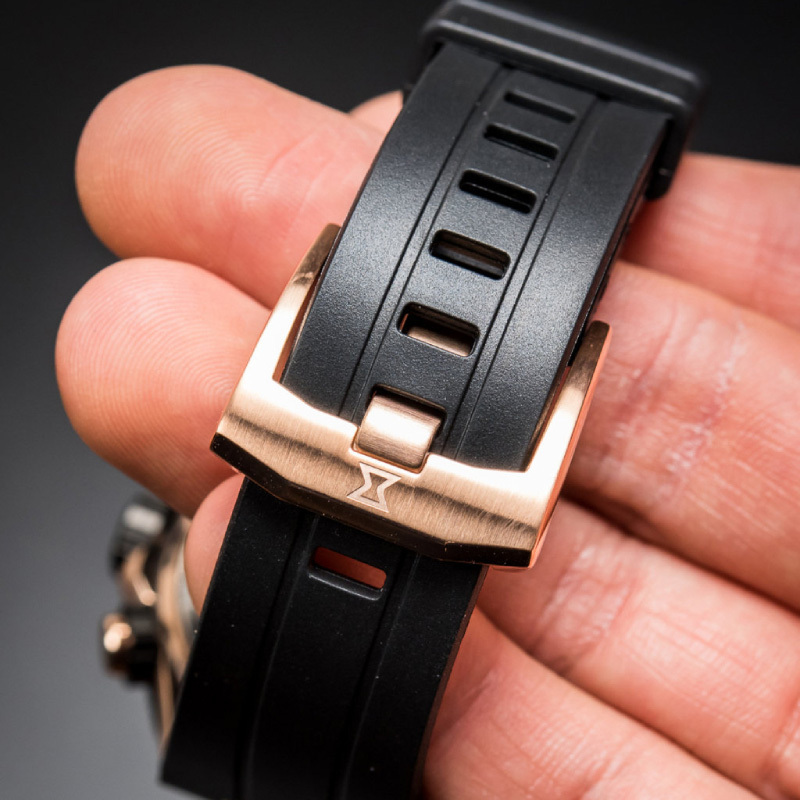 Ремешок: Чёрный каучук с классической застежкой из нержавеющей стали с PVD покрытием цвета розового золота.