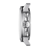 Функции: Центральные часовая и минутная стрелки, секундная стрелка вынесена на отдельный циферблат. Часы-хронограф с секундомером и тахиметром. В механизме 4 камня. Функция индикации заряда (EOL). Окошко даты находится между часовыми отметками 4 и 5.