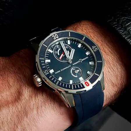 Ремешок: Каучуковый ремешок синего цвета с титановой вставкой и браслетной застежкой.