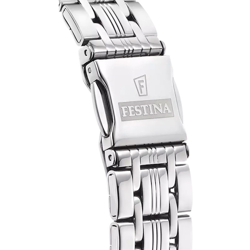 Ремешок: Стальной браслет с раскладывающейся застежкой, которая украшена фирменным логотипом Festina.