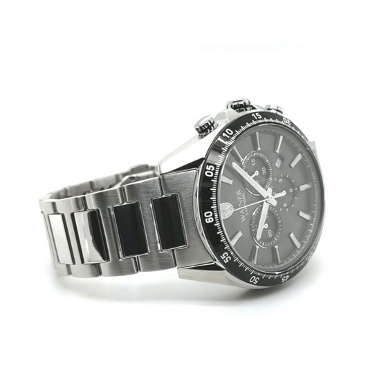 Корпус: Круглый корпус из нержавеющей стали 316L. Циферблат зелёного цвета, защищен устойчивым к царапинам сапфировым стеклом и украшен фирменным логотипом Wainer в положении 12 часов. Метки в виде рисок. Люминесцентные стрелки. Рифленая заводная головка с защитой. Диаметр корпуса 45 мм. Водонепроницаемость 100 метров.