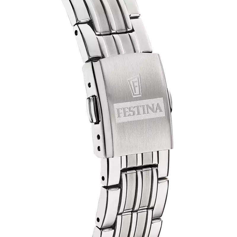 Ремешок: Надежный, прочный браслет из нержавеющей стали. Застёжка с системой блокировки, украшена фирменным логотипом Festina.