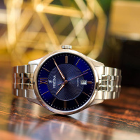 Корпус: Круглый стальной корпус c сатинированной поверхностью. Синий циферблат украшен гильоше с метками в виде штрихов и 12-ти часовая метка в виде римской цифры. Стрелки с люминесцентным покрытием. Минеральное стекло. Рифленая заводная головка с защитой. Габаритные размеры: D 43мм, толщина 10,35мм. Водонепроницаемость: 50 м.