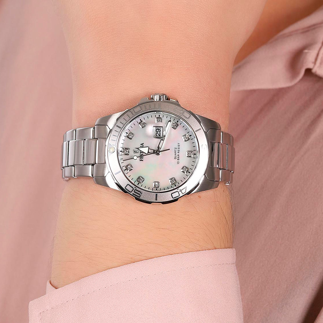 Ремешок: Надежный стальной браслет с раскладывающейся застежкой, которая украшена фирменным логотипом Festina.