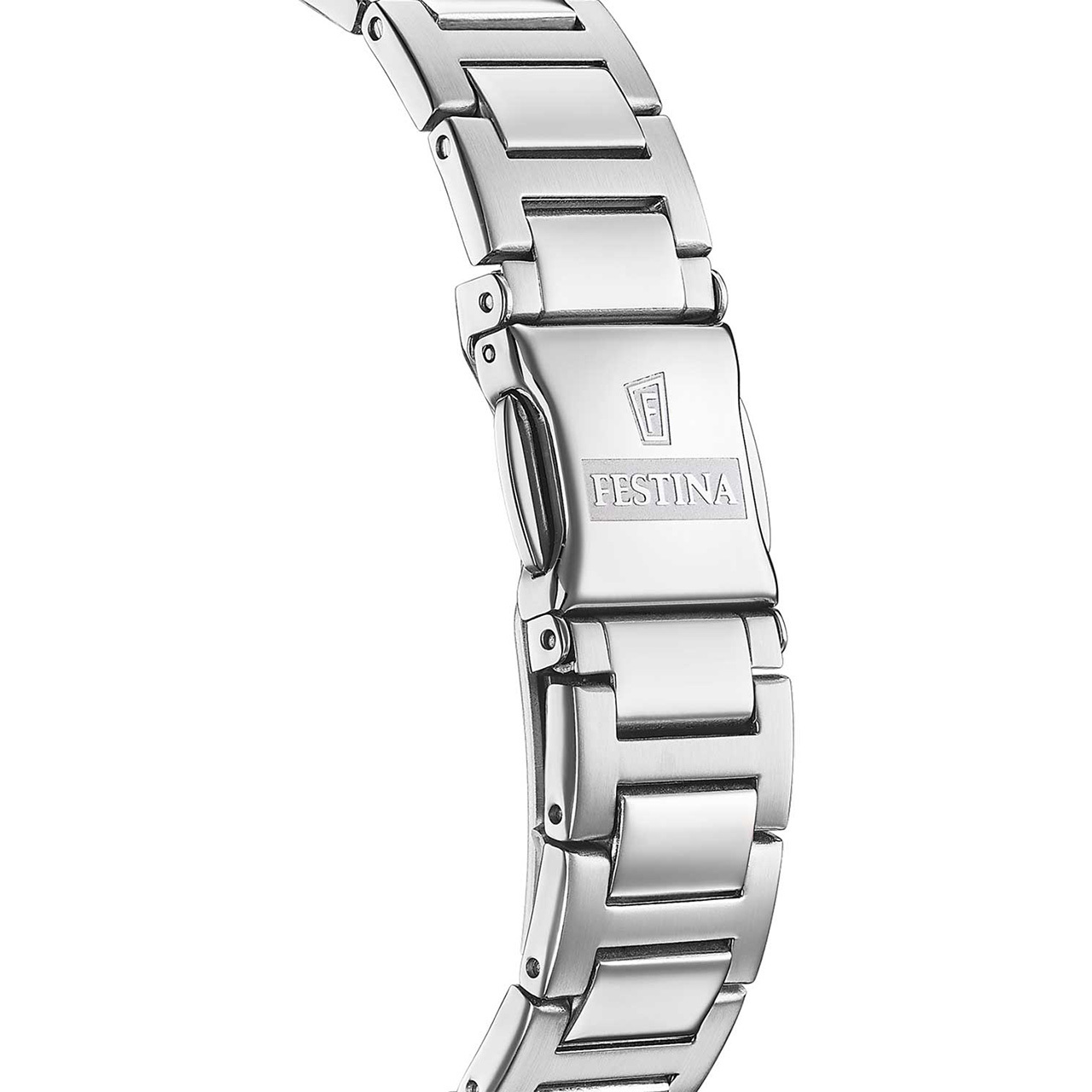 Ремешок: Стальной браслет с раскладывающейся застежкой, которая украшена фирменным логотипом Festina.