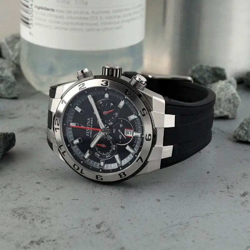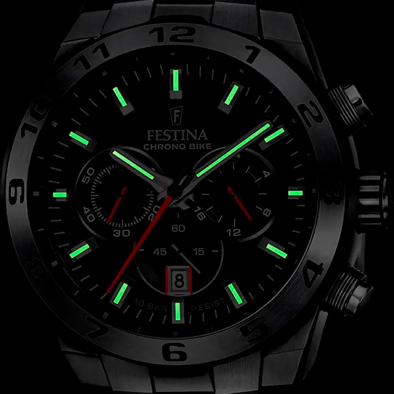 Корпус: Наручные часы Festina в корпусе из нержавеющей стали 316L. Чёрный циферблат защищён от внешнего воздействия минеральным стеклом. Стрелки и метки с люминесцентным покрытием. Рифленая заводная головка. Безель c PVD-покрытием. Водозащита корпуса 10 АТМ позволит плавать, нырять и заниматься другими водными видами спорта. Диаметр 44,5мм, толщина 12,45мм.