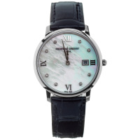 Корпус:  Нержавеющая сталь. Циферблат белый перламутровый украшен бриллиантами. Сапфировое стекло. Диаметр 36 мм. Водонепроницаемость 30 метров.