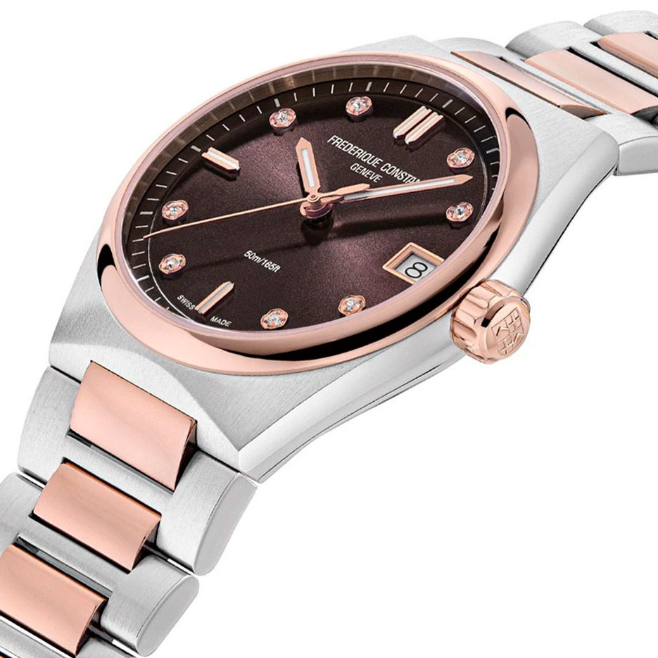Корпус: Корпус круглой формы выполнен из нержавеющей стали марки 316L с частичным гальваническим покрытием. Циферблат коричневого цвета украшен бриллиантами. Стрелки и метки с люминесцентным покрытием. Сапфировое стекло имеет повышенную устойчивость к возникновению царапин. Диаметр 31 мм. Водостойкость 50 метров.