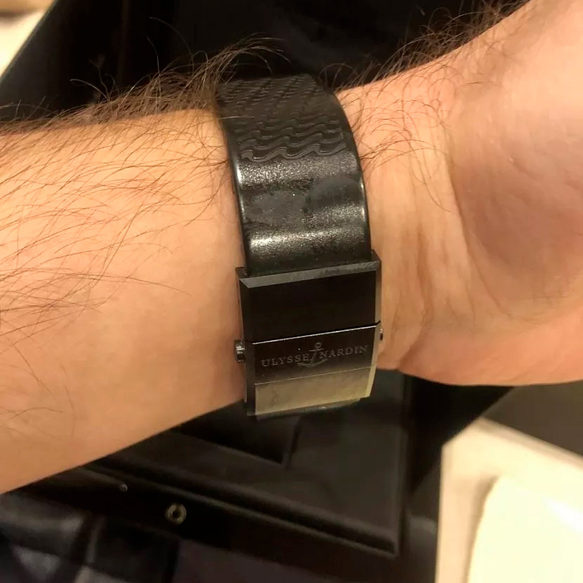 Ремешок: Каучуковый ремешок с керамическими вставками и браслетной застежкой.