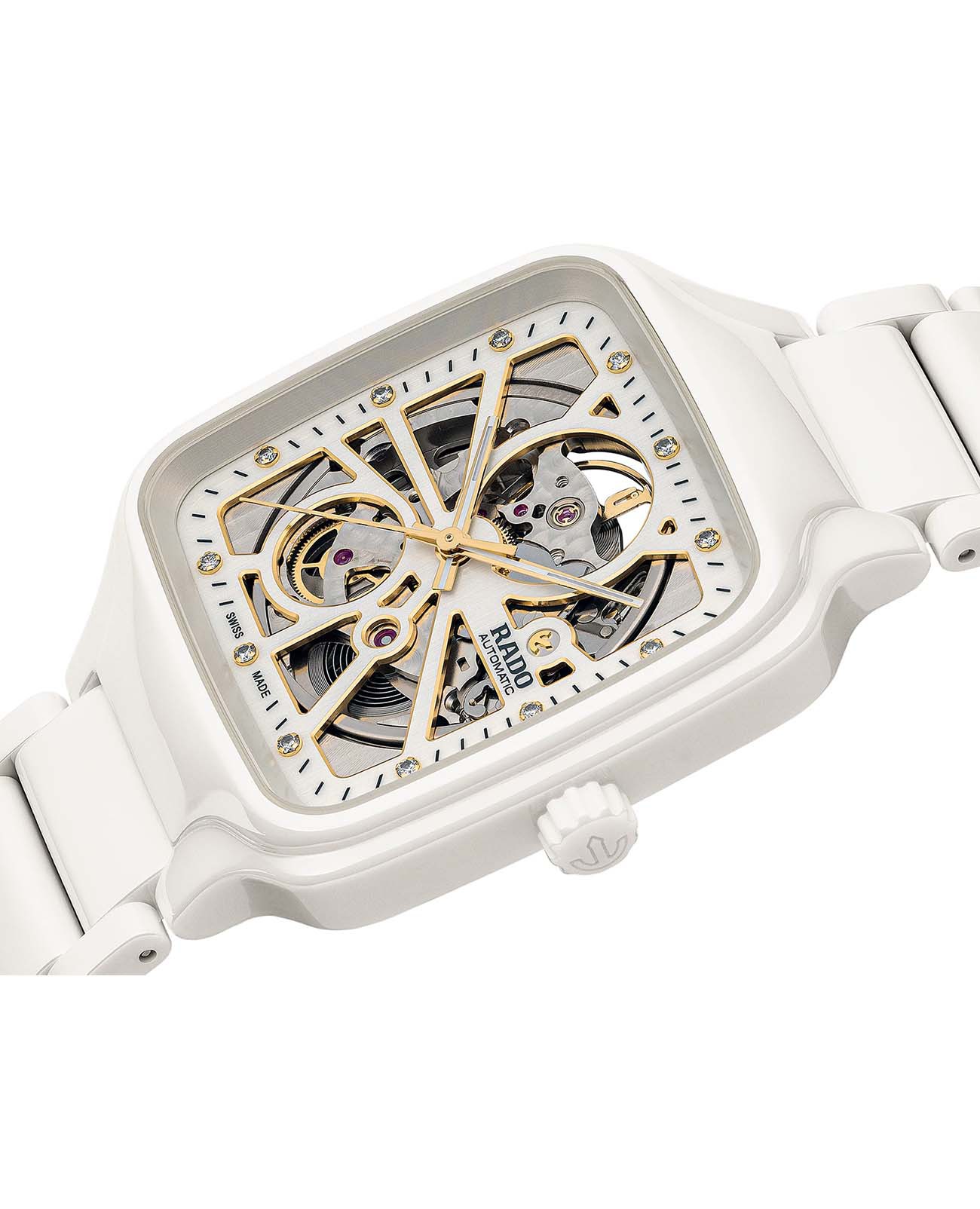 Корпус: Первые часы Rado квадратной формы с корпусом моноблок из высокотехнологичной керамики белого цвета. Белый циферблат. 12 бриллиантов. Стрелки и часовые индексы позолоченные с покрытием SuperLuminova. Сапфировое стекло с антибликовым покрытием. Прозрачная задняя крышка из сапфирового стекла. Размер: 38x38 мм. Водозащита: 50 м.