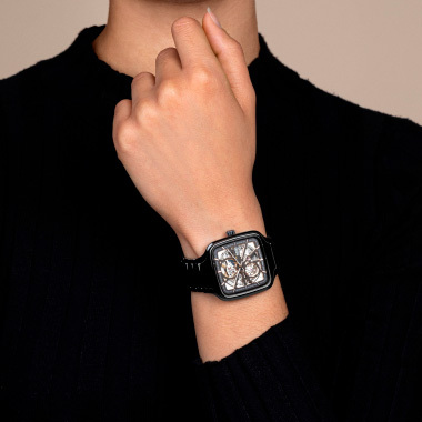 Корпус: Высокотехнологичная керамика чёрного цвета квадратной формы с корпусом моноблок. Скелетонированный циферблат чёрного цвета, золотистые стрелки и часовые индексы с люминесцентным покрытием. Сапфировое стекло с антибликовым покрытием. Прозрачная задняя крышка из сапфирового стекла. Водозащита 50 м. Размер 38 x 38 мм, толщина 9,7 мм.