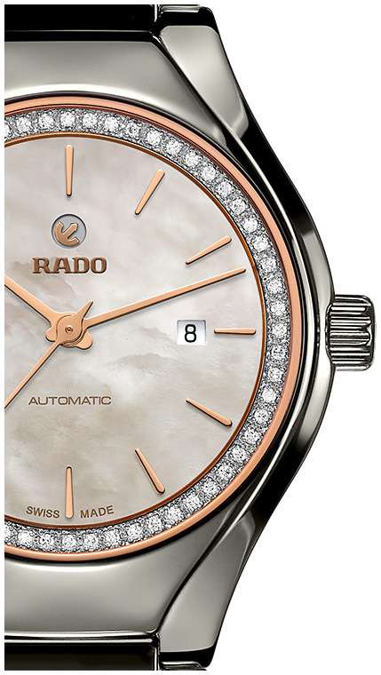 Корпус: Корпус выполнен из высокотехнологичной плазменной керамики. Циферблат светлый перламутровый, декорирован 60 бриллиантами. Золотистые стрелки. Сапфировое стекло. Диаметр 30 мм. Водозащита 50 м.