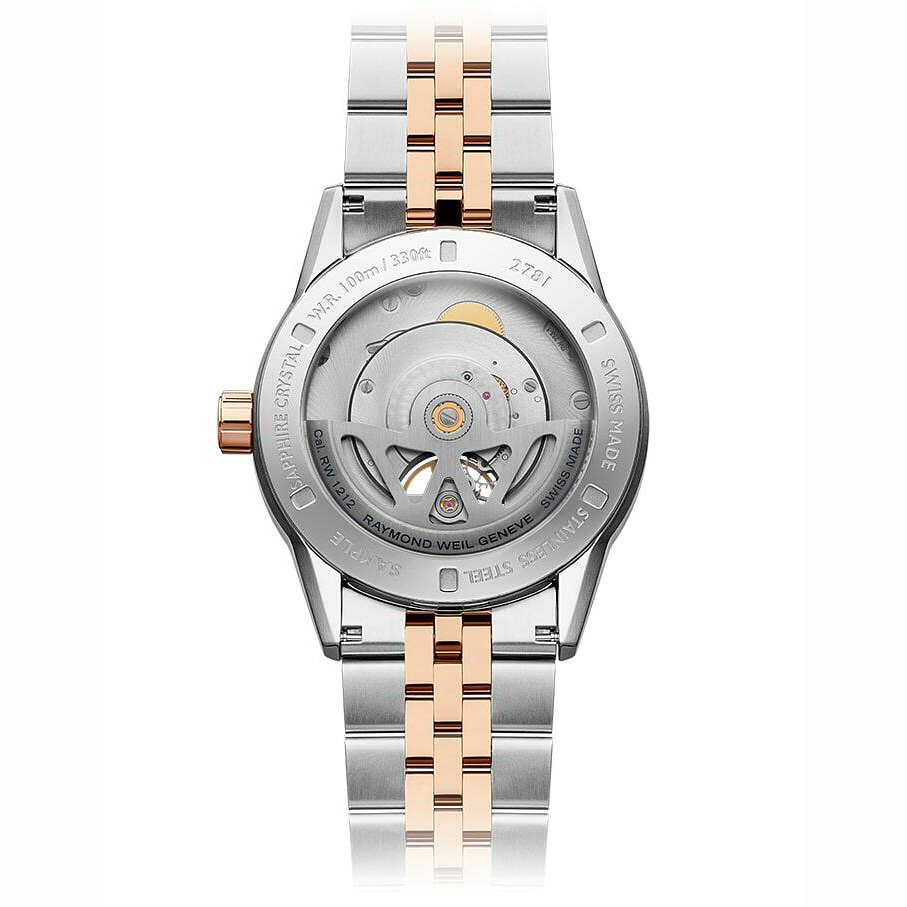 Ремешок: Браслет из высококачественной стали с 5 рядами литых звеньев, центральный ряд звеньев с золотым покрытием. Браслетная застежка, раскладывающаяся при нажатии на кнопки с двойной системой блокировки, украшена гравировкой Raymond Weil.
