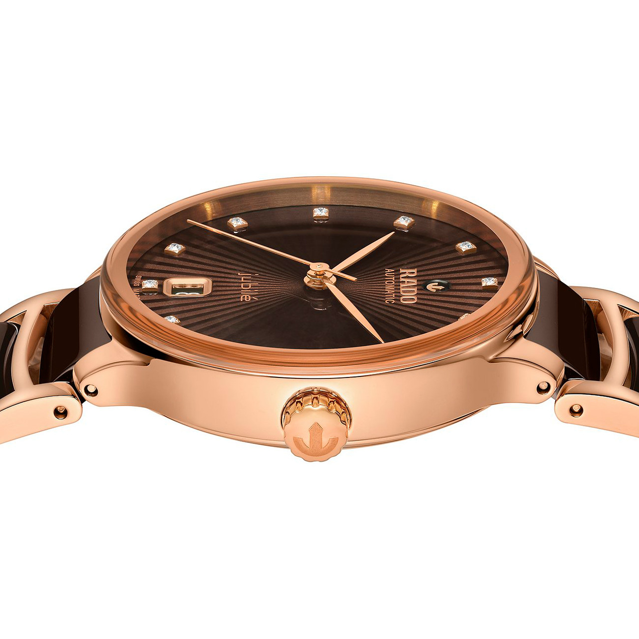 Ремешок: Браслет со вставками из высокотехнологичной керамики с обрамляющими звеньями с PVD-покрытием цвета розового золота.