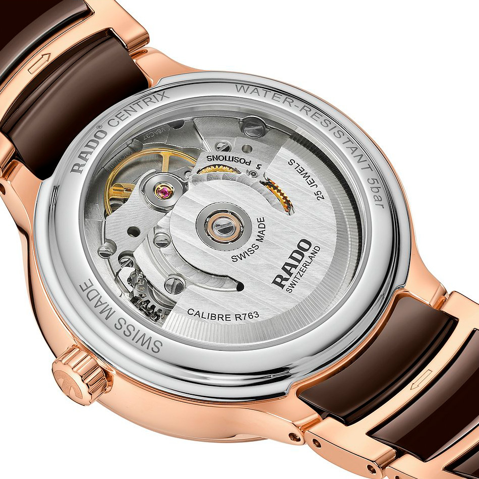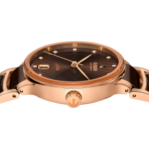 Корпус: Нержавеющая сталь с PVD покрытием из розового золота. Коричневый граненый циферблат имеет роскошный трехмерный эффект, созданный путем штамповки фигурного циферблата с последующим заполнением его лаком. Циферблат декорирован 12 бриллиантами. Сапфировое стекло с антибликовым покрытием. Прозрачная задняя крышка. Диаметр 35 мм. Водозащита 50 метров позволит защитить корпус от случайных брызг или капель дождя.