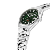 Корпус: Корпус выполнен из высокосортной нерж. стали с полировкой и матовой шлифовкой (сатинированием) поверхностей. Циферблат имеет зеленую окраску изумрудного цвета, гильоширование со стилизованным изображением Земного шара. Аппликация часовых индексов и стрелки с родиевым покрытием. Люминесцентный состав светящийся в темноте на стрелках и часовых индексах. Сапфировое стекло с повышенной устойчивостью к появлению царапин имеет антибликовое покрытие с обеих сторон. Заводная коронка украшена миниатюрой эмблемой марки. Задняя крышка с прозрачным окном соединяется с корпусом 4 винтами. Водостойкость 10 АТМ. Диаметр корпуса составляет 39 мм, толщина - 10,34 мм.