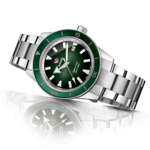 Корпус: Корпус выполнен из высококачественной стали с повышенной устойчивостью к коррозии, поверхности с полировкой до зеркального блеска. Однонаправленный керамический безель, зелёного цвета вращается со щелчками в направлении против хода стрелок. Зелёный циферблат. Люминесцентный состав на стрелках и на разметке циферблата. Сапфировое стекло, это лучшее стекло для наручных часов, которое не царапается при механическом воздействии, его можно повредить только алмазом. Завинчивающаяся задняя крышка, закручивающаяся заводная головка. Диаметр: 42 мм. Водозащита до 300 метров позволит плавать, нырять и погружаться под воду с аквалангом.