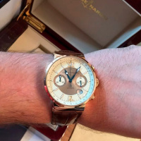 Корпус: Розовое золото 18 карат, бежевый циферблат со светло-серым центром, сапфировое стекло с антибликовым покрытием. Диаметр 41 мм, водонепроницаемость 200 метров.