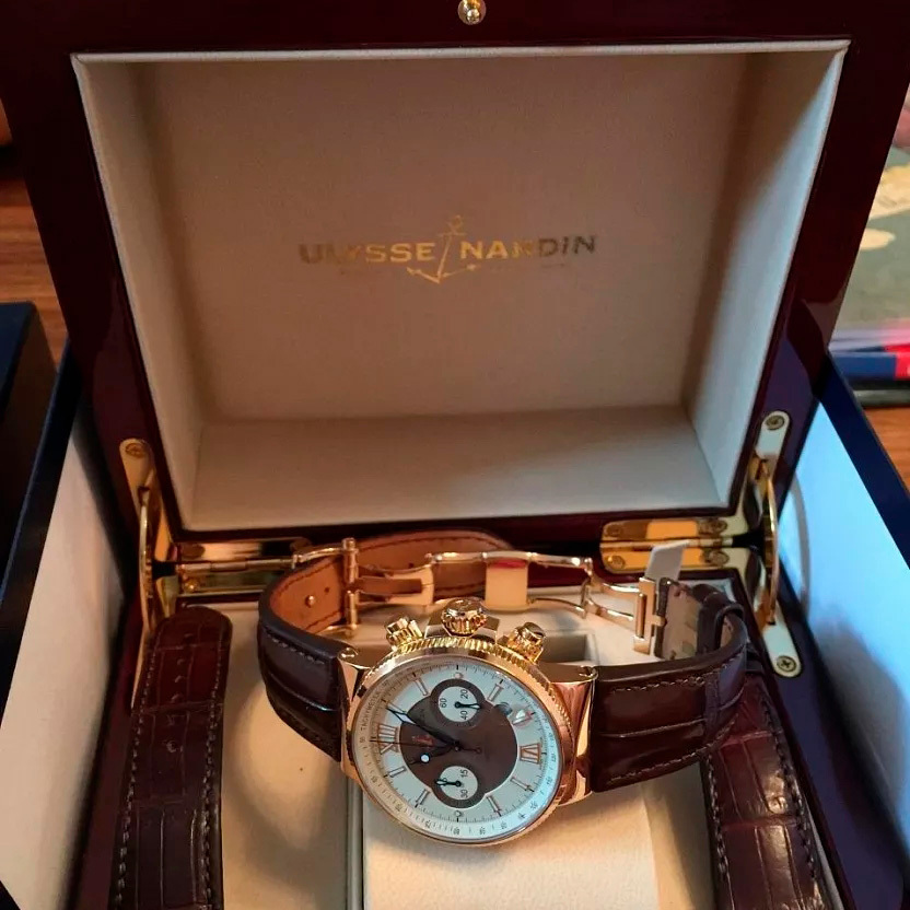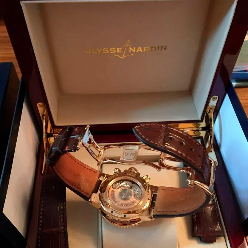 Ремешок: Кожаный ремешок коричневого цвета из кожи аллигатора с раскладывающейся застежкой из розового золота 18 карат.