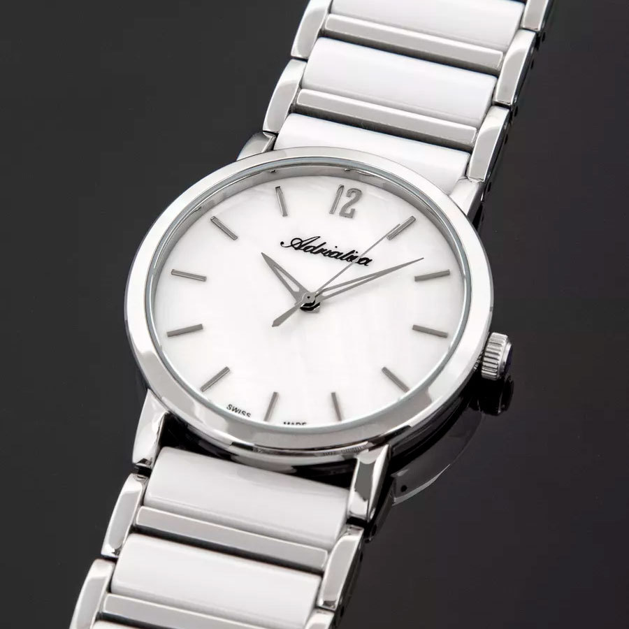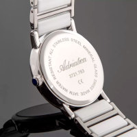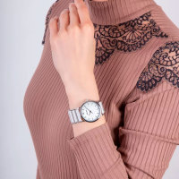 Корпус: Круглый корпус выполнен из полированной нержавеющей стали. Белый перламутровый циферблат. Накладные часовые метки и стрелки выполнены из стали. Минеральное стекло. Диаметр корпуса составляет 36 мм, толщина 7 мм. Водостойкость WR 30 (мытье рук, дождь).