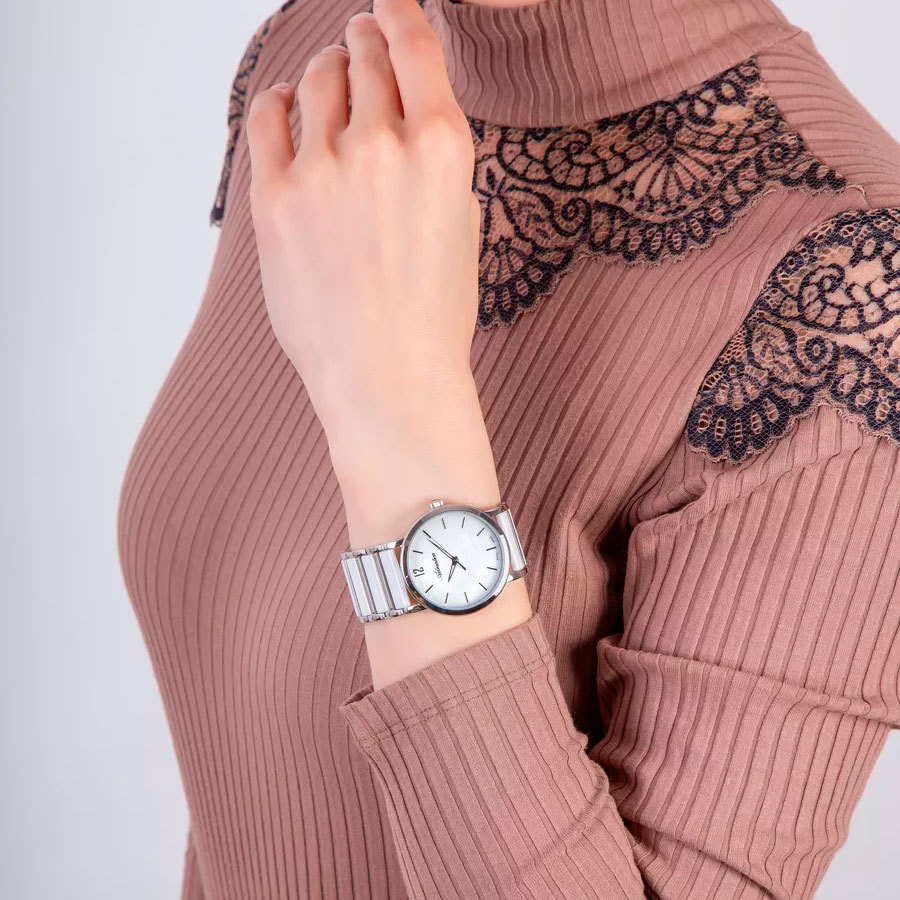 Ремешок: Браслет выполнен из нержавеющей стали с белыми керамическими вставками. Раскладывающаяся застежка с гравировкой логотипа.
