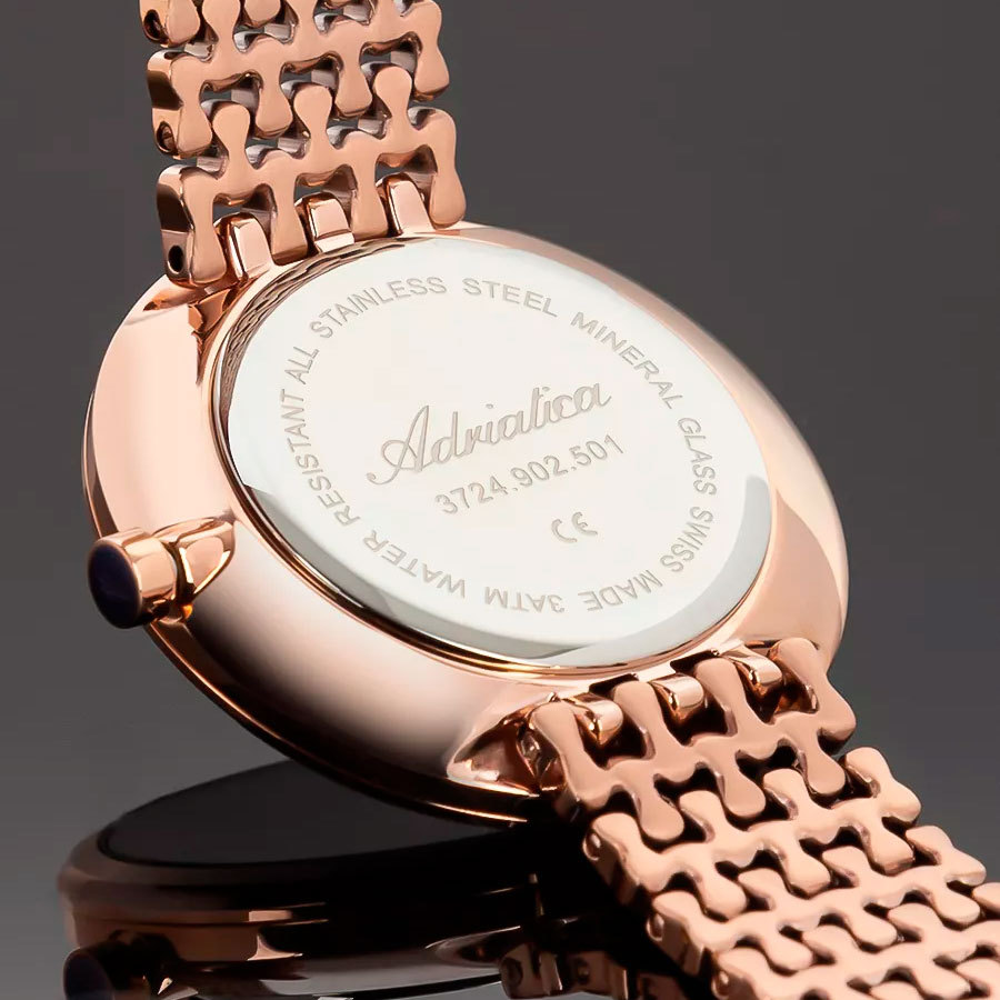 Корпус: Круглый корпус выполнен из полированной нержавеющей стали с розовым PVD покрытием золотом. Чёрный циферблат выполнен по технологии Sunray (солнечные лучи) и украшен 12 кристаллами. Накладные часовые индексы и стрелки выполнены из позолоченной стали. Минеральное стекло. Диаметр корпуса составляет 34 мм, толщина 7 мм. Водостойкость WR 30 (мытье рук, дождь).