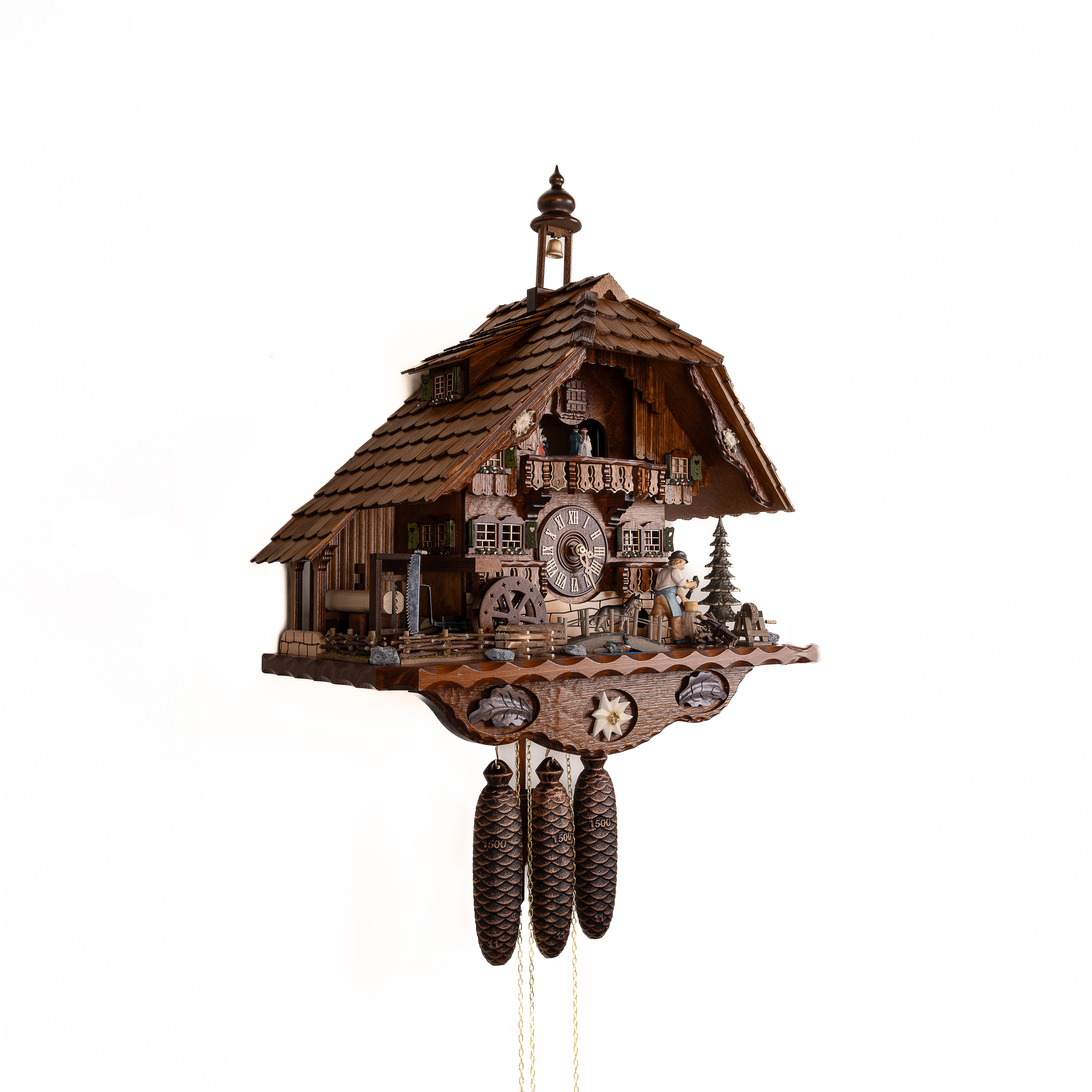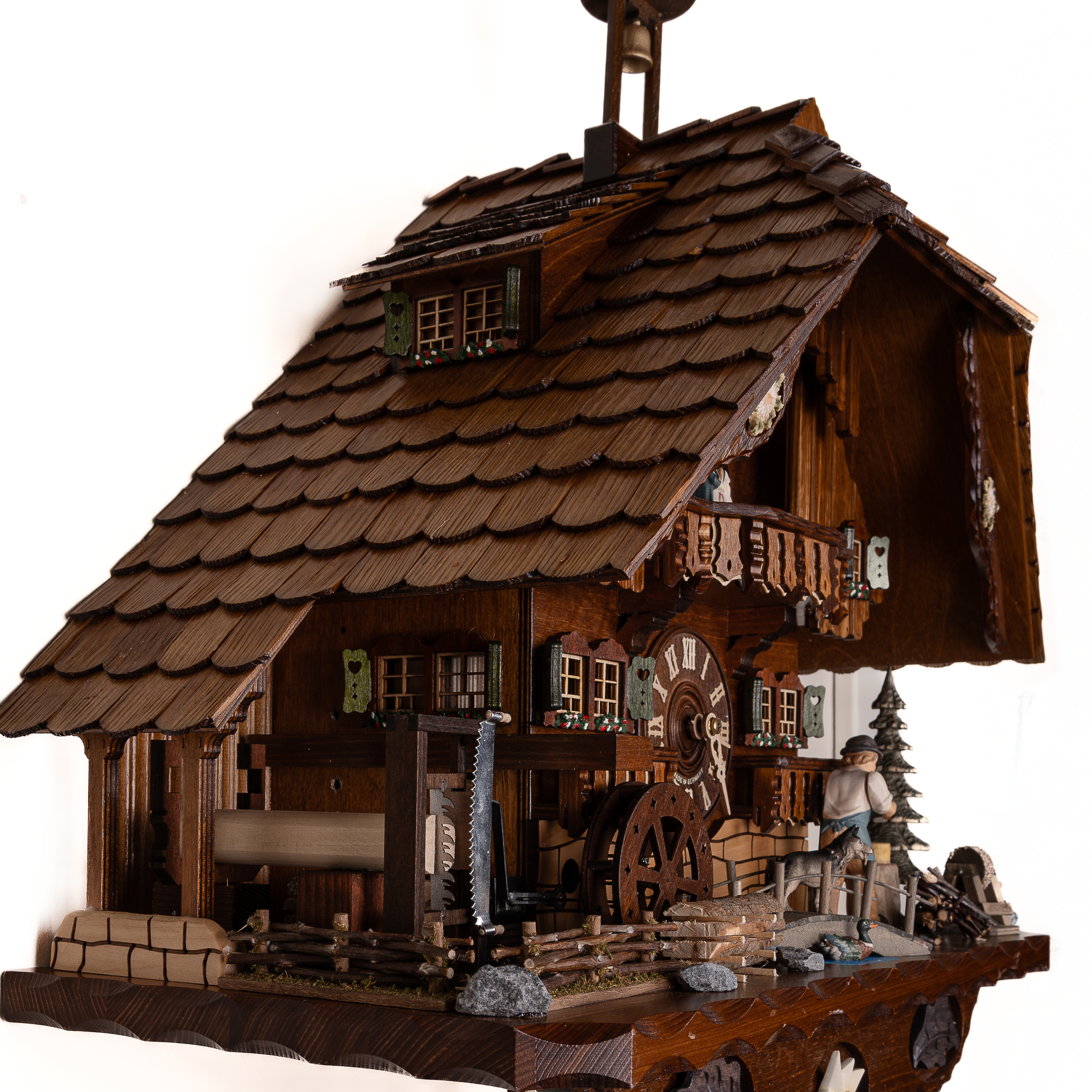 Механизм: Механические часы с кукушкой, которые работают от гирь на цепной тяге. Сделан на фирме SBS-Feintechnik GmbH & Co. KG Германия. Шварцвальдский дом с подвижным дровосеком и танцующими парами на балконе. Запас хода на 8 дней. Ручное отключение звука. В каждые пол часа кукушка появляется из своего домика, наклоняется и воспроизводит звук кукушки (ку-ку) один раз, в каждый полный час она кукует столько раз сколько показывают стрелки на часах. После этого на балкончике начинают кружиться в танце деревянные фигурки под музыку (2 мелодии чередуются). Одна гиря в данных часах отвечает за ход часового механизма, вторая за механизм кукушки, а третья за воспроизведение музыки, как в музыкальной шкатулке и движение танцующих фигурок на балконе. В то время пока кукушка кукует дровосек колет дрова и продолжает это делать пока кукушка не остановится.