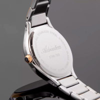 Корпус: Круглый корпус выполнен из полированной нержавеющей стали с PVD покрытием желтого золота. Циферблат цвета шампань украшен 10 цирконами. Минеральное стекло с сапфировым покрытием. Диаметр корпуса составляет 33 мм, толщина 7 мм. Водостойкость WR 30 (мытье рук, дождь).