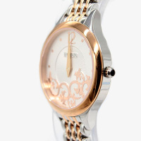 Корпус: Нержавеющая сталь с частичный PVD - покрытием цвета розового золота. Металлик циферблат с позолоченными стрелкамии и часовыми индексами, декорирован узором «арабески». Циферблат защищен высокопрочным сапфировым стеклом. Заводная головка украшена камнем в форме кабошона. Диаметр: 29 мм. Водостойкость: 50 м.