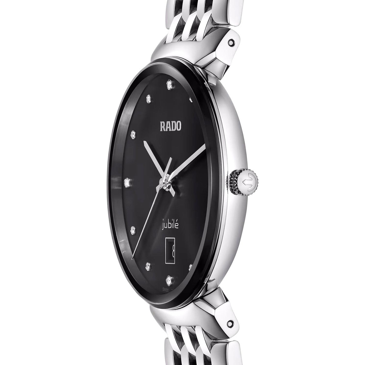 Корпус: Корпус изготовлен из полированной нержавеющей стали 316L. Черный циферблат с 12 бриллиантами (4 бриллиантами - 0.032 ct. и 8 бриллиантами - 0.030 ct), украшенный логотипом «jubilé», идеально сочетается с стрелками, покрытыми родием в стиле Baton. Часы оснащены изогнутым сапфировым стеклом со скошенными краями. Рифленая заводная головка. Диаметр: 38 мм. Водостойкость: 50 м.