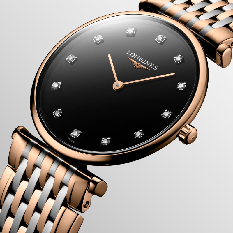 Корпус: Нержавеющая сталь + PVD-покрытие из розового золота, сапфировое стекло, 12 бриллиантов на циферблате. Размер 29 мм, водонепроницаемость 30 метров. Циферблат – черный.