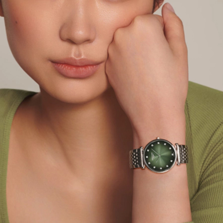 Корпус: Корпус выполнен из высококачественной стали 316L с повышенной устойчивостью к коррозии, поверхность с полировкой до зеркального блеска. Циферблат зелёного цвета выполнен по технологии Sunray (солнечные лучи), украшен 12 бриллиантами группы Top Wesselton VS-SI общим весом 0,081 карата. Сапфировое стекло с антибликовым покрытием защищает циферблат от царапин и обеспечивает отличную читаемость при любом освещении. Диаметр корпуса: 29мм, вес 55,5г. Водостойкость: 30 метров.
