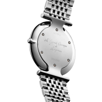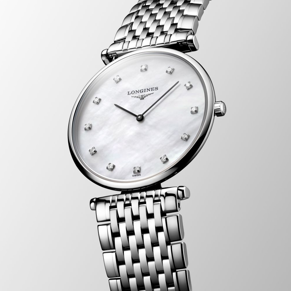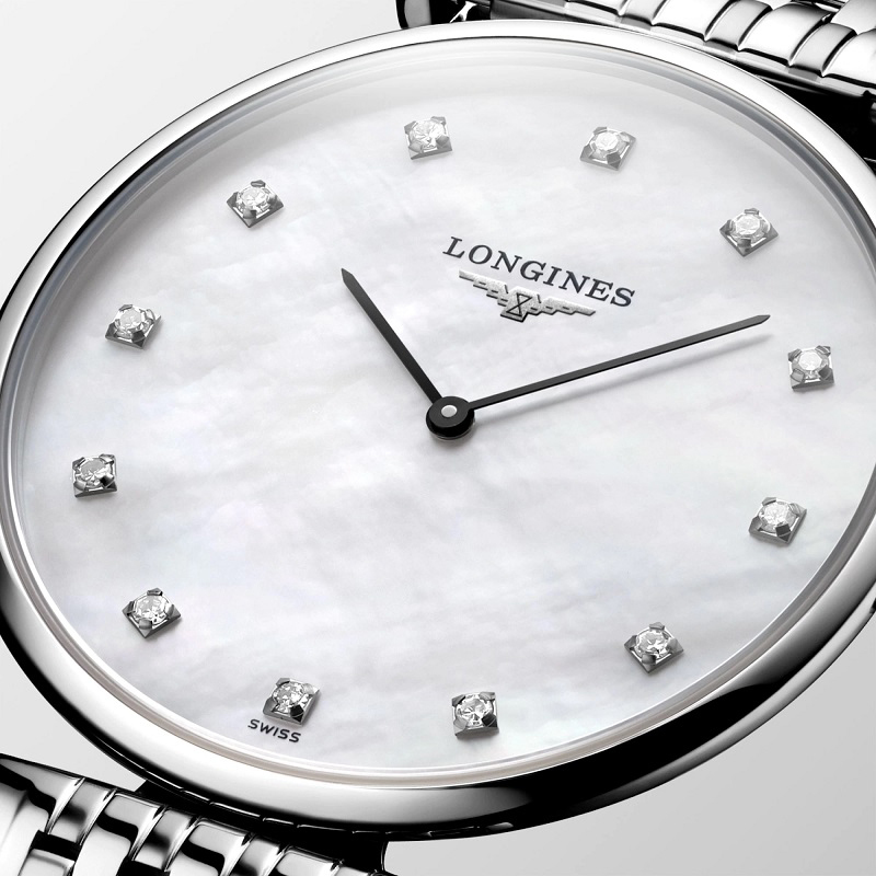 Корпус: Нержавеющая сталь, сапфировое стекло, 12 бриллиантов на циферблате. Размер 33 мм, водонепроницаемость 30 метров. Циферблат – перламутровый белый.