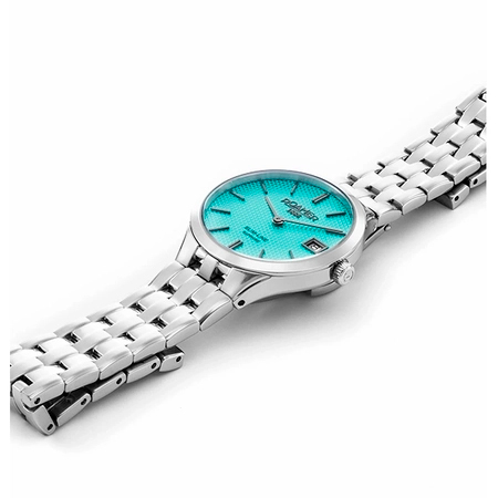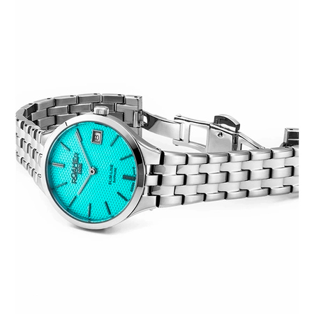 Корпус: Высококачественная нержавеющая сталь, марки 316L с повышенной устойчивостью к коррозии и полировкой до зеркального блеска. Цвет циферблат Tiffany. Накладные индексы серебристого цвета и тонкие стрелки обеспечивают четкую читаемость, не нарушая минималистичный стиль. Сапфировое стекло с антибликовым покрытием. Рифлёная заводная головка с логотипом марки «Roamer». Диаметр: 30 мм. Водонепроницаемость: 50 м.