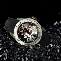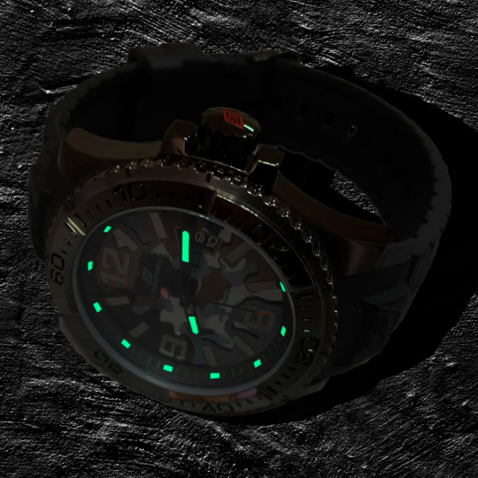 Корпус: Корпус выполнен из стали 316L с PVD покрытием. Необычный, многослойный циферблат, повторяет расцветку хаки. Стрелки и индексы покрыты люминесцентным составом и светятся в темноте. Однонаправленный вращающийся безель. Завинчивающаяся заводная головка и винтовая задняя крышка. Закаленное минеральное стекло Hardlex разработанное компанией Seiko Watch Corporation, которое обладает высокой устойчивостью к ударам и царапинам. Диаметр 45 мм. Водозащита 10 бар (100 метров).
