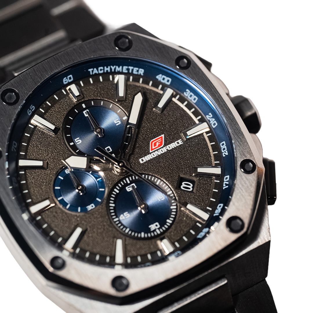 Ремешок: Браслет изготовлен из высококачественной нержавеющей стали с IP покрытием серого цвета. Каждые часы бренда Chronoforce имеют уникальную упаковку, в виде мотоциклетного шлема.