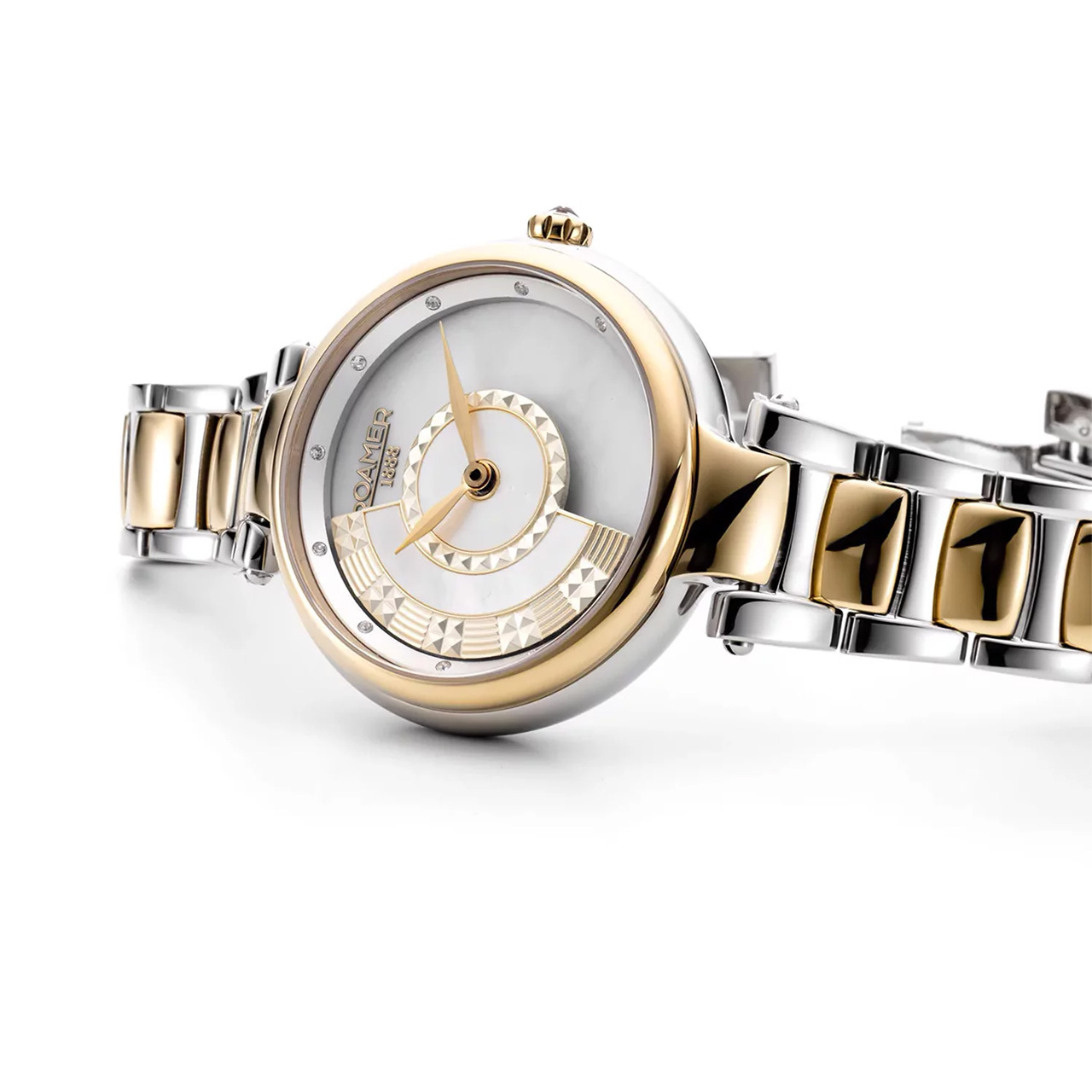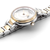 Корпус: Корпус из нержавеющей стали, марки 316L с частичным IP покрытием. Перламутровый циферблат с позолоченными стрелками и часовыми индексами в виде точек, дополнен драгоценными мерцающими камнями циркона. Сапфировое стекло с антибликовым покрытием. Благодаря изысканной двухслойной технологии циферблат удивляет эффектом вращения, который заставляет волнистый узор буквально двигаться, очаровывая, мягко покачивая нижнюю половину циферблата во время ношения. Диаметр: 36 мм. Водонепроницаемость: 50 м