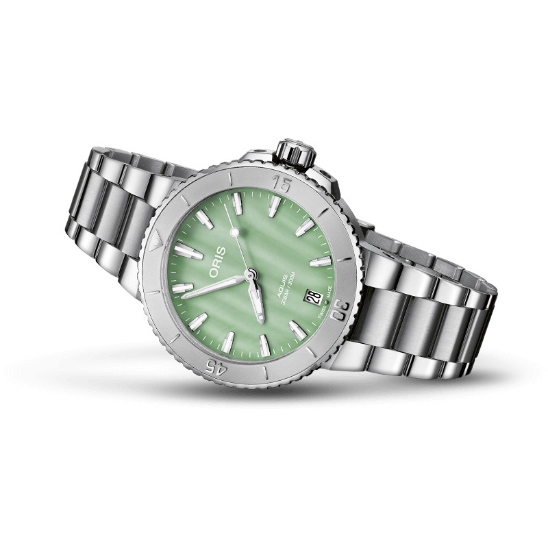 Корпус: Многокомпонентный корпус из нержавеющей стали, минутная шкала на безеле. Циферблат из зеленого перламутра. Сапфировое стекло, выпуклое с обеих сторон, внутреннее антибликовое покрытие. Индексы и стрелки покрыты составом Superluminova BG W9. Завинчивающаяся задняя крышка со специальной гравировкой. Завинчивающаяся заводная головка из нержавеющей стали. Диаметр: 36,5 мм. Водонепроницаемость: 300 метров.