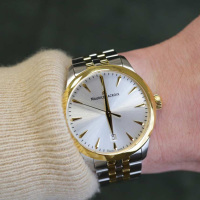 Корпус: Круглый корпус выполнен из нержавеющей стали 316Lс частичным PVD-покрытием желтого цвета, поверхность с матовой шлифовкой – сатинированием и полировкой до алмазного блеска. Серебристый циферблат с эффектом солнечных лучей (Sunray). Накладные часовые индексы и клиновидные стрелки в стиле Dauphine с PVD-покрытием. Сапфировое стекло с антибликовым покрытием устойчиво к царапинам сохраняет прозрачность на протяжении многих лет. Заводная головка украшена фирменным логотипом. Диаметр корпуса составляет: 39 мм., толщина - 9 мм. Класс водозащиты: 10 бар (100 метров), позволит плавать.