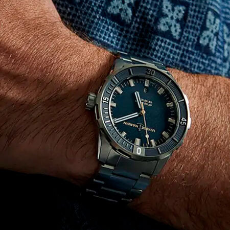 Корпус: Корпус часов выполнен из высококачественной нержавеющей стали, которая обеспечивает надежную защиту механизма. Однонаправленный безель синего цвета, вращается со щелчками в направлении против хода стрелок. Циферблат синего цвета. Контрастные часовые метки и стрелки с люминесцентным покрытием обеспечивают отличную видимость даже в темноте. Выпуклое сапфировое стекло с антибликовым покрытием, нанесенным обе стороны стекла. Завинчивающаяся заводная коронка с двойным уплотнителями для защиты от попадания влаги внутрь корпуса. Диаметр: 42 мм. Водостойкость: 300 метров.