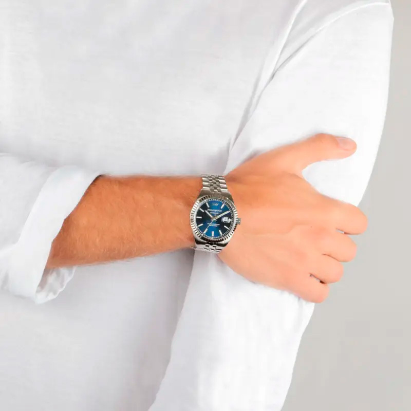 Корпус: Корпус выполнен из высококачественной стали с повышенной устойчивостью к коррозии, поверхности с матовой шлифовкой – сатинированием и полировкой до зеркального блеска. Циферблат глубокого синего цвета с шлифовкой “солнечные лучи" украшен 10 бриллиантами. Люминесцентный состав на стрелках. Сапфировое стекло, это лучшее стекло для наручных часов, которое не царапается при механическом воздействии, его можно повредить только алмазом. Диаметр корпуса: 35 мм. Водозащита до 100 метров позволит плавать.