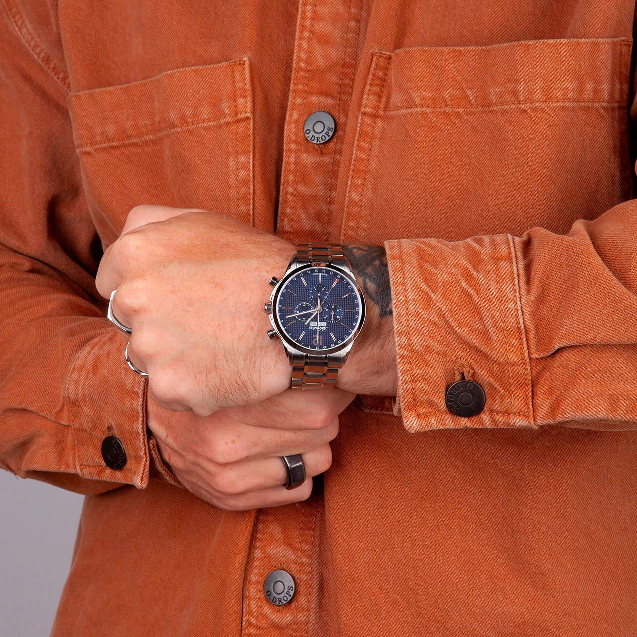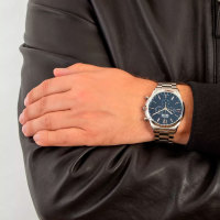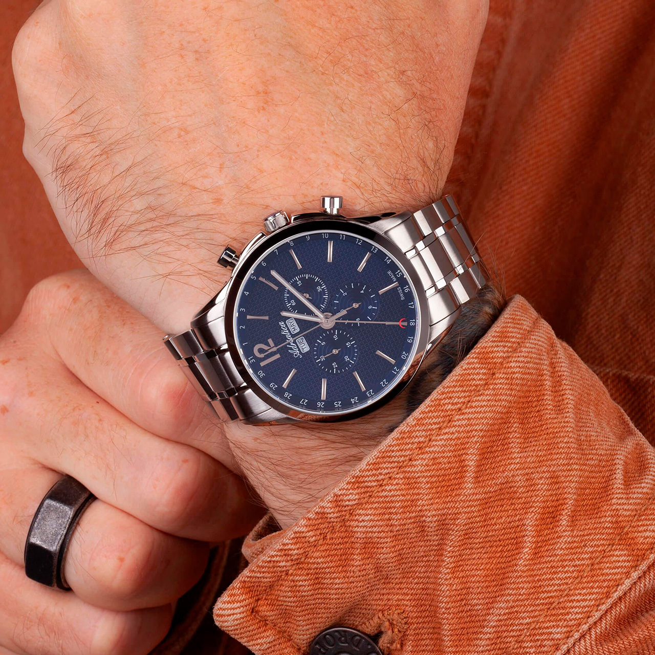 Корпус: Круглый корпус выполнен из полированной нержавеющей стали. Синий циферблат с узором гильоше. Накладные часовые индексы выполненый из стали. Стрелки с покрытием SuperLuminova, которое обеспечивает подсветку в темное время суток. Минеральное стекло с сапфировым покрытием. . Диаметр корпуса составляет 45 мм, толщина 11 мм. Водостойкость WR 50 (мытье рук, дождь).