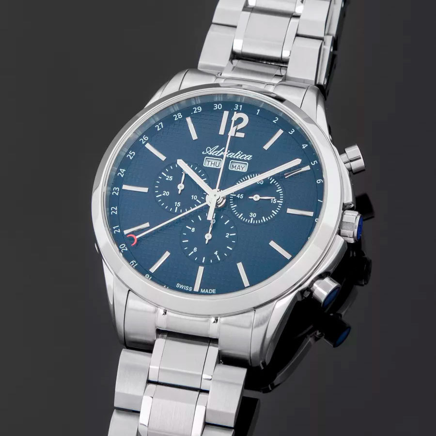 Функции: Центральные часовая и минутная стрелки, секундная стрелка вынесена на отдельный циферблат. День недели. Месяц. Число. Секундомер.