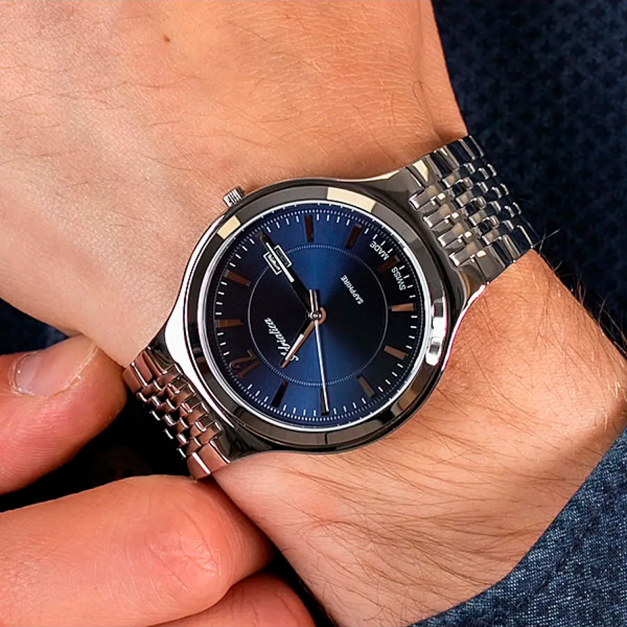 Корпус: Круглый корпус выполнен из полированной нержавеющей стали. Синий циферблат выполнен по технологии Sunray (солнечные лучи). Накладные часовые индексы и стрелки выполнены из стали. Стрелки с покрытием SuperLuminova, которое обеспечивает подсветку в темное время суток. Сапфировое стекло устойчивое к возникновению царапин. Диаметр корпуса составляет 42 мм, толщина 7 мм. Водостойкость WR 50 (мытье рук, дождь).